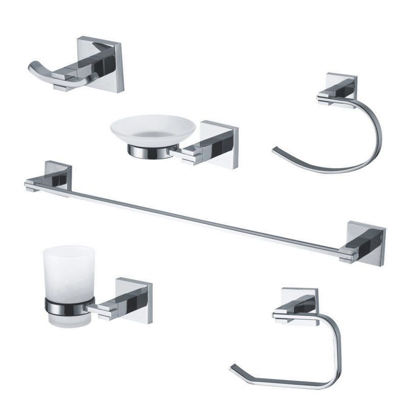 Percha, Aro toallero, Barral toallero, Porta rollo, Jabonera, Porta vaso y cepillos.