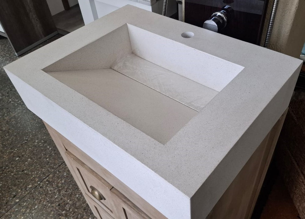 Bacha de apoyo en cuarzo con desague escondido.